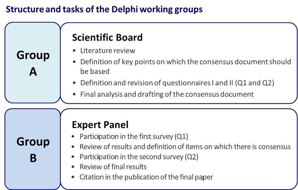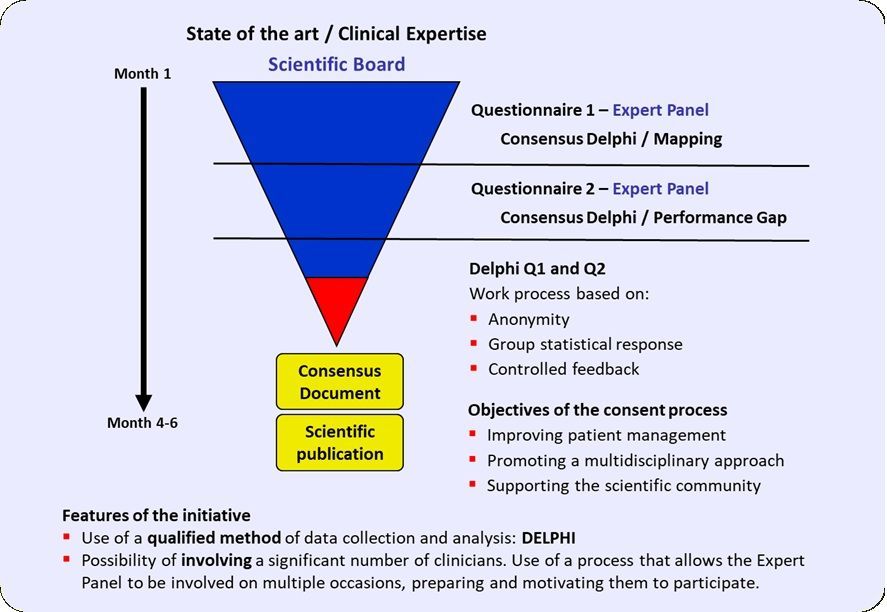 The project is coordinated by a Scientific Board, which is largely multidisciplinary and consists of clinicians with particular expertise in the area that Delphi intends to explore. The activity involves the participation of an Expert Panel of clinicians, recognized as experts in the field, who are called upon to answer questions posed by the Scientific Board.