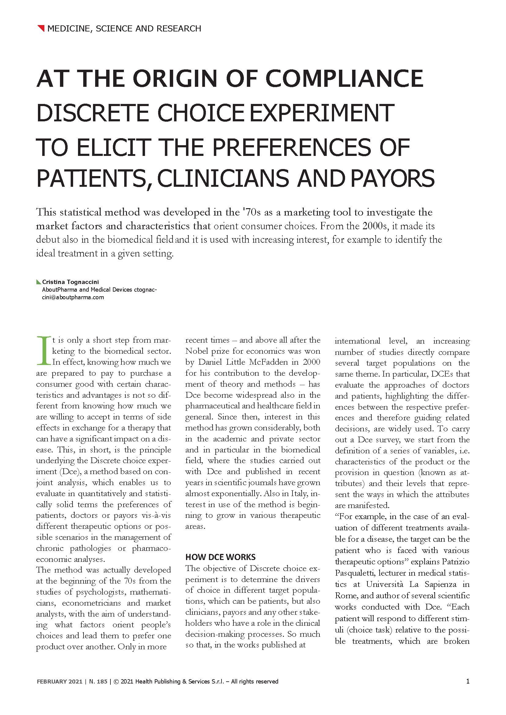 In recent years, there has been a significant increase in the number of scientific publications based on Discrete Choice Experiments in the medical and clinical fields. In particular, various health authorities such as the FDA, EMA, and AIFA have expressed interest and initiated studies (e.g., the PREFER Project) on the use and evaluation of patient and clinician preferences in drug registration decision-making processes.
