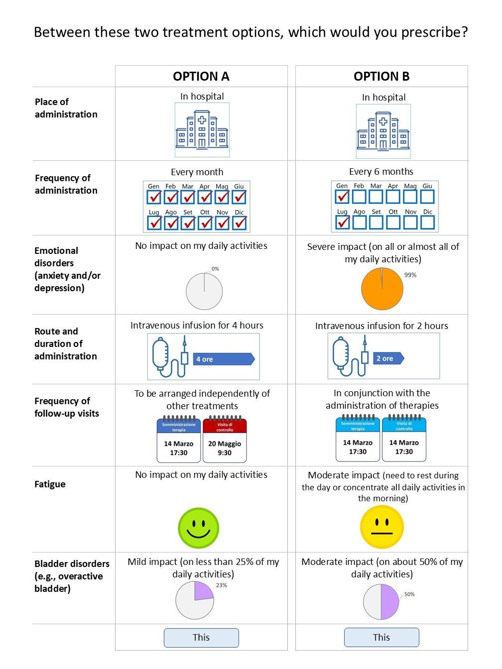 Patients' preferences can be expressed in terms of the importance of what matters most to them in relation to treatments (route of administration, frequency of administration, efficacy, side effects, place where treatment is administered), expressing how much risk they consider acceptable in order to obtain a certain benefit (trade-off) as well as the compromises they are willing to make between the characteristics of different treatments or, more generally, healthcare interventions.