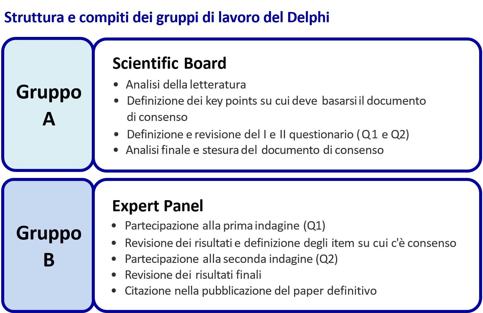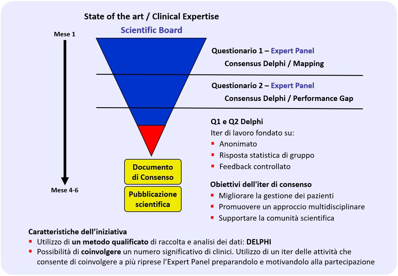 Il progetto è coordinato da un Scientific Board, per lo più multidisciplinare, costituito da clinici particolarmente esperti nell’area che il Delphi intende approfondire. L’attività prevede la partecipazione di un Expert Panel di clinici, riconosciuti come esperti della materia, che è chiamato a rispondere ai quesiti posti dal Scientific Board.