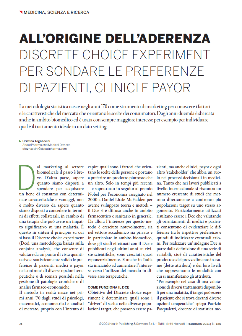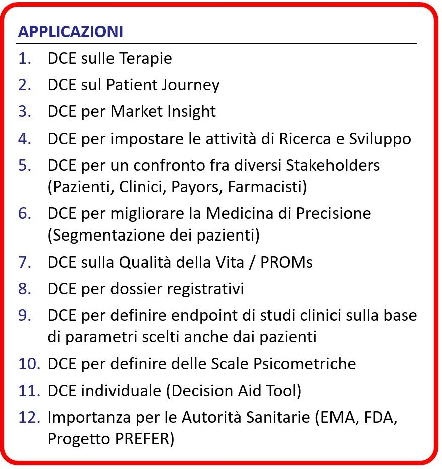 Negli ultimi anni è cresciuto molto il numero di pubblicazioni scientifiche basate sul Discrete Choice Experiment in ambito medico e clinico e, in particolare, diverse autorità sanitarie come FDA, EMA e la stessa AIFA hanno espresso interesse e avviato studi (ad esempio il Progetto PREFER) per un utilizzo e una valorizzazione delle preferenze dei pazienti e dei clinici nei processi decisionali di registrazione dei farmaci.
