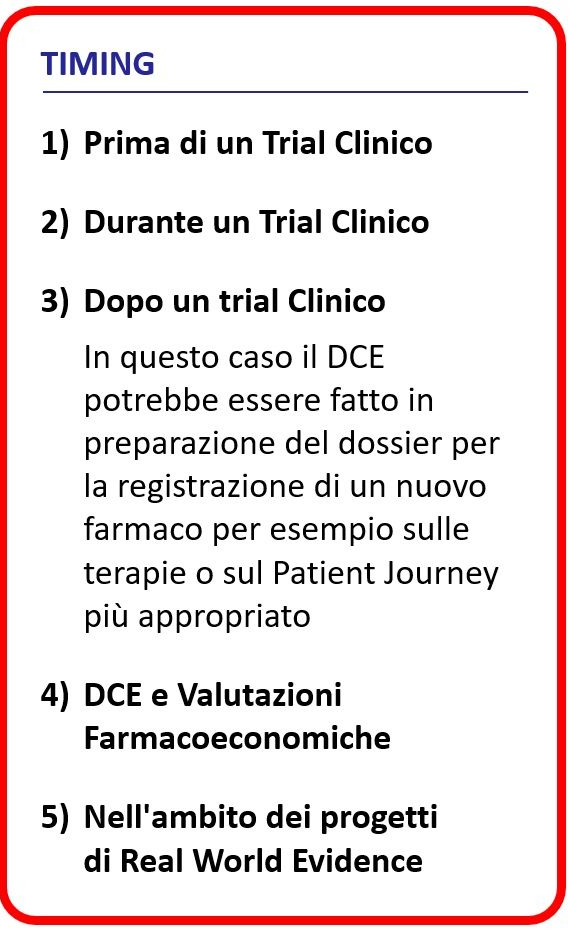 I risultati degli studi DCE possono essere allegati ai dossier registrativi a supporto dell’approvazione di un nuovo farmaco, nuove indicazioni terapeutiche, nuove formulazioni.